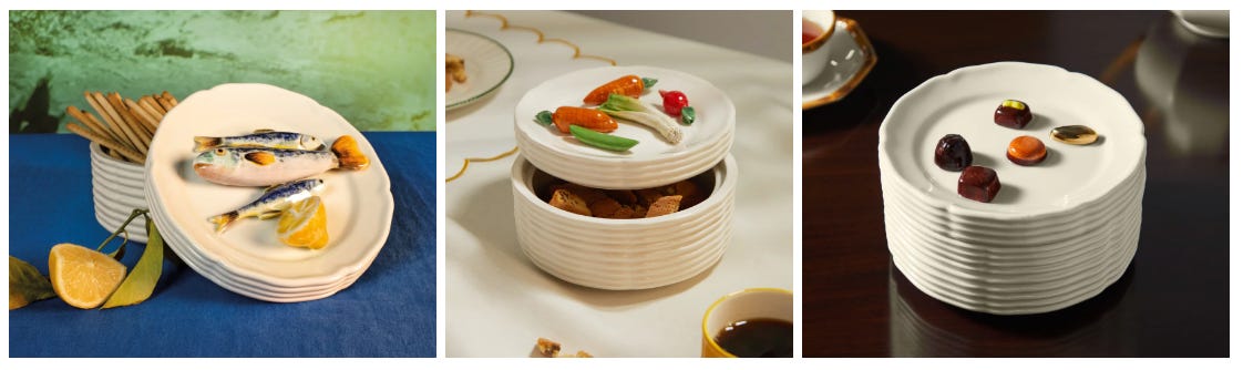 Hand made by one of the oldest ceramic manufacturers in Europe, these Este Ceremaiche Ceramic Trompe-L'oeil boxes look like stacks of china with chocolates, fish or veggies on top – your pick – $385.